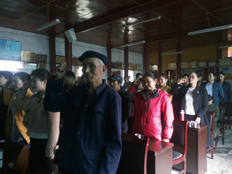 温誓词。为进一步增强党员的党性意识,充分发挥党员先锋模范作用。全体党员面对鲜红的党旗,举起右手,在副支书的带领下庄严宣誓:“我志愿加入中国共产党,拥护党的纲领,遵守党的章程,履行党员义务……随时准备为党和人民牺牲一切,永不叛党。”通过重温入党誓词,让党员牢记党员身份,更加坚定信念跟党走。